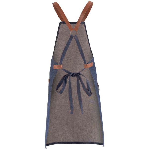 Ποδιά τύπου μπροστέλα jean με μπροστινές τσέπες και προσαρμοζόμενο μέγεθος.